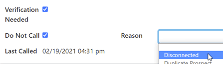 This will populate the list of prospects that need verification. You may now open each prospect, Verify the ‘Disconnected’ status by calling or searching for the correct Phone number, and, if necessary, select DNC with the reason of Disconnected.