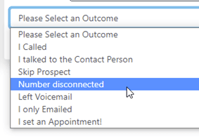During the course of calling, a Sales rep may indicate that the prospect they just called, had a disconnected number. They indicate this by selecting ‘Number Disconnected’ in the Call Outcome list.